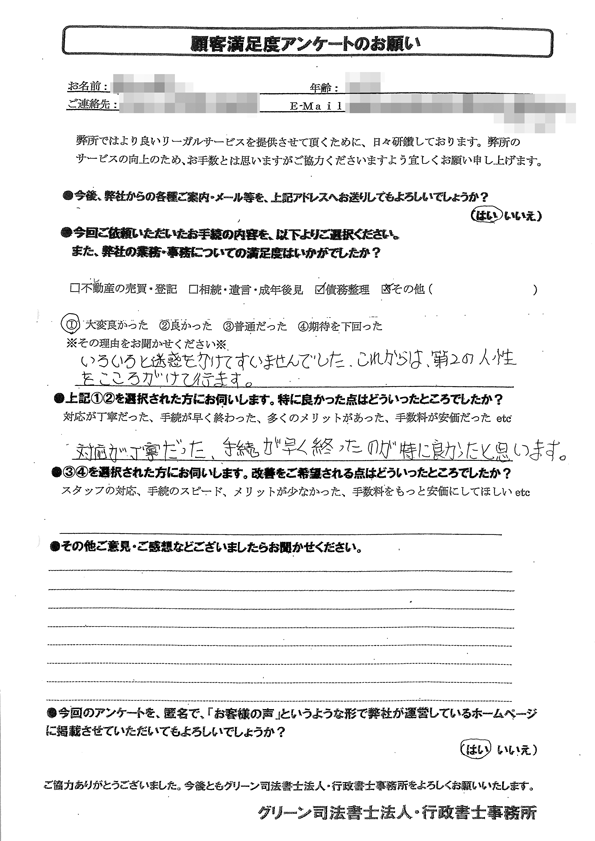 しかし、自己破産では一定の範囲の借金を除いて、すべての借金が免責されるので、相談者のかたにとっては、新たな人生をスタートできるチャンスとなります。